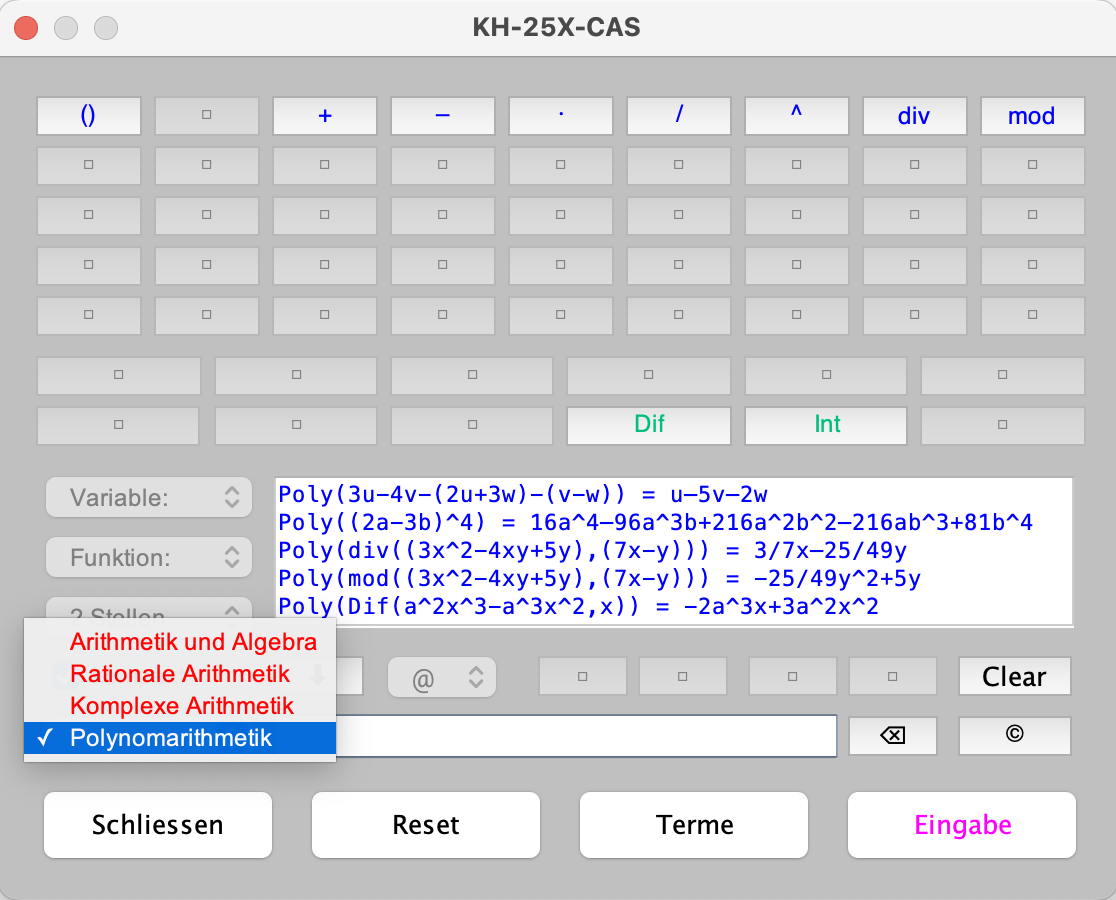 Polynomarithmetik: In diesem Modus können multivariate Polynomoperationen in den Variablen a-z durchgeführt werden.