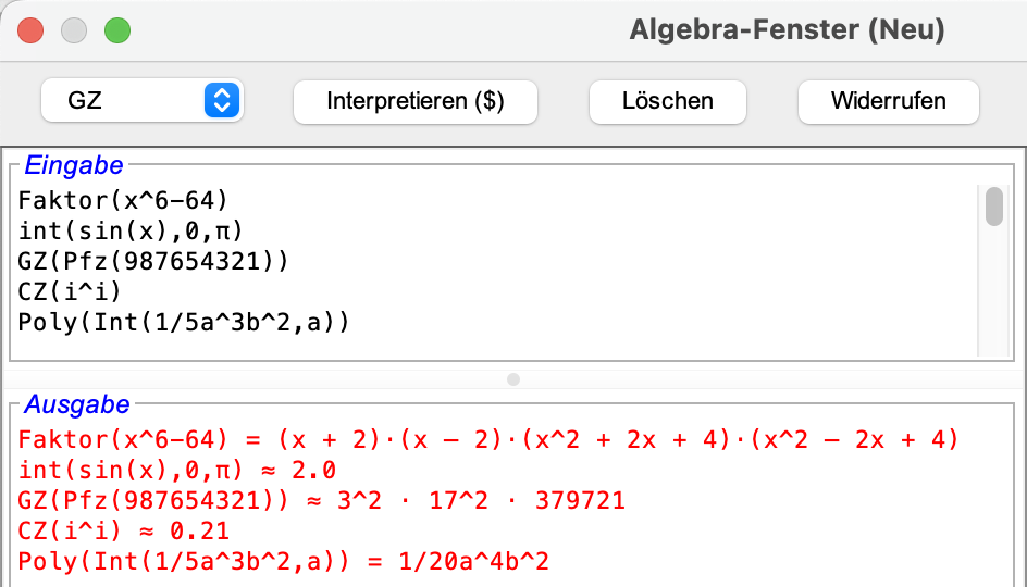 Arithmetik und Algebra: Hier kann man mit Dezimalzahlen, Vektoren, Matrizen und univariaten Polynomen (Variable x) rechnen.