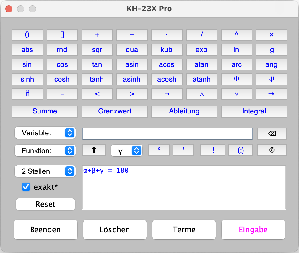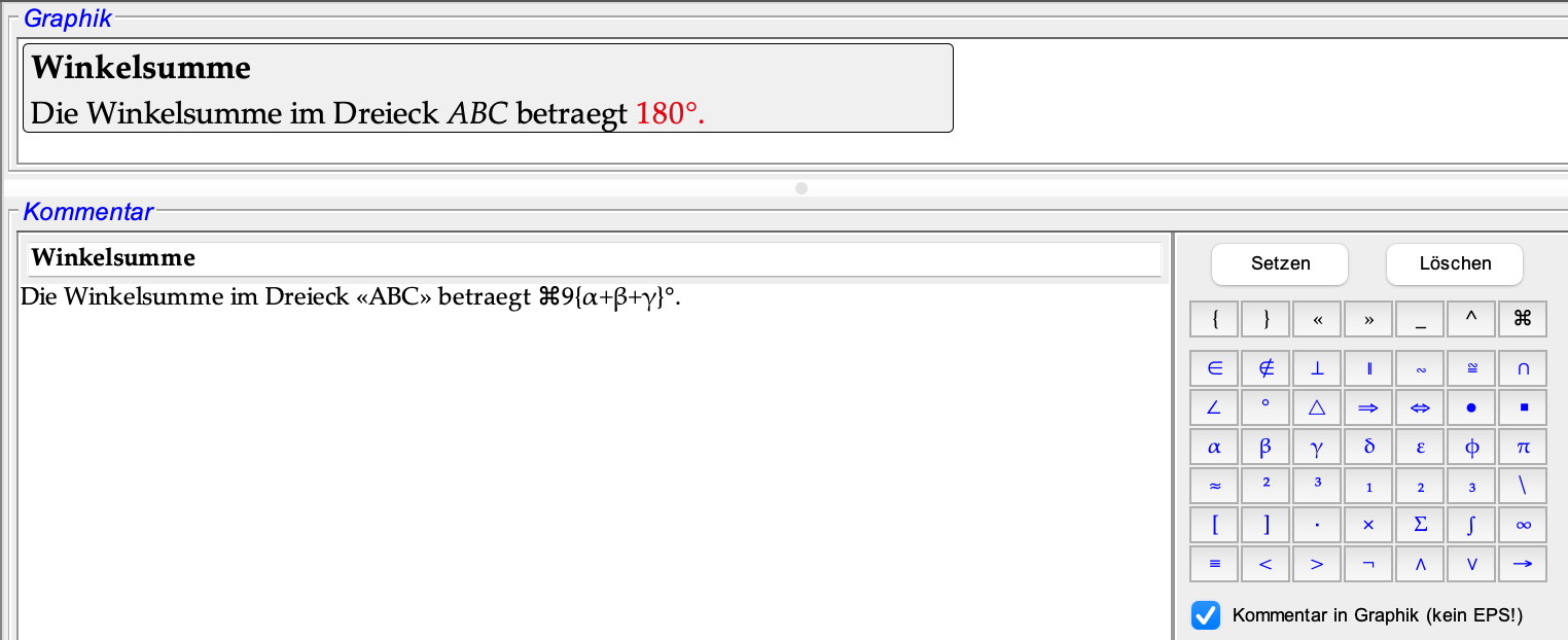 Im Kommentarfeld ⑦ können Text eingegeben werden, welche auch arithmetische Ausdrücke enthalten können. Ab Geopro 3 müssen Terme in geschweifte Klammern gesetzt werden, z.B. {α+β+γ}, wobei α, β und γ wiederum gemessene Werte sind.