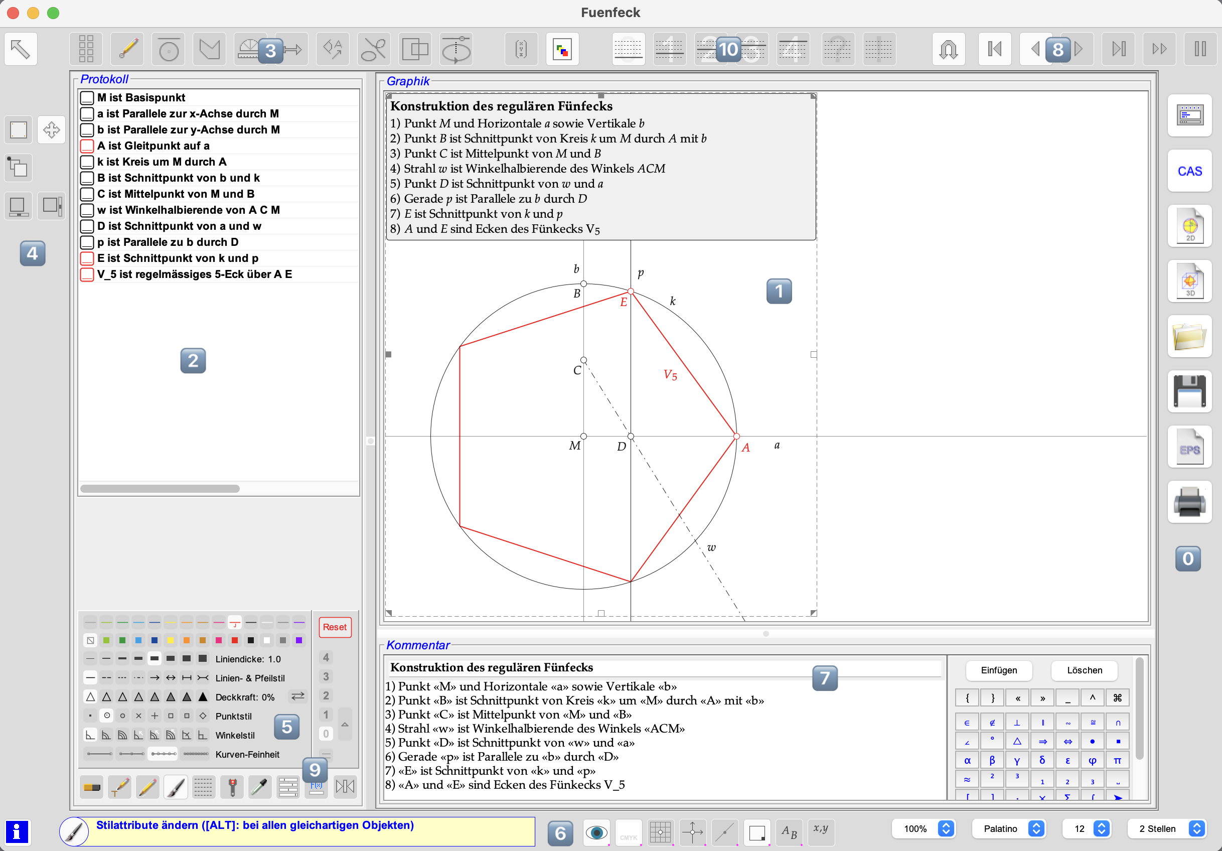 In ⑤ können die Objektattribute (Name, Farbe, Liniendicke, etc.) voreingestellt werden.