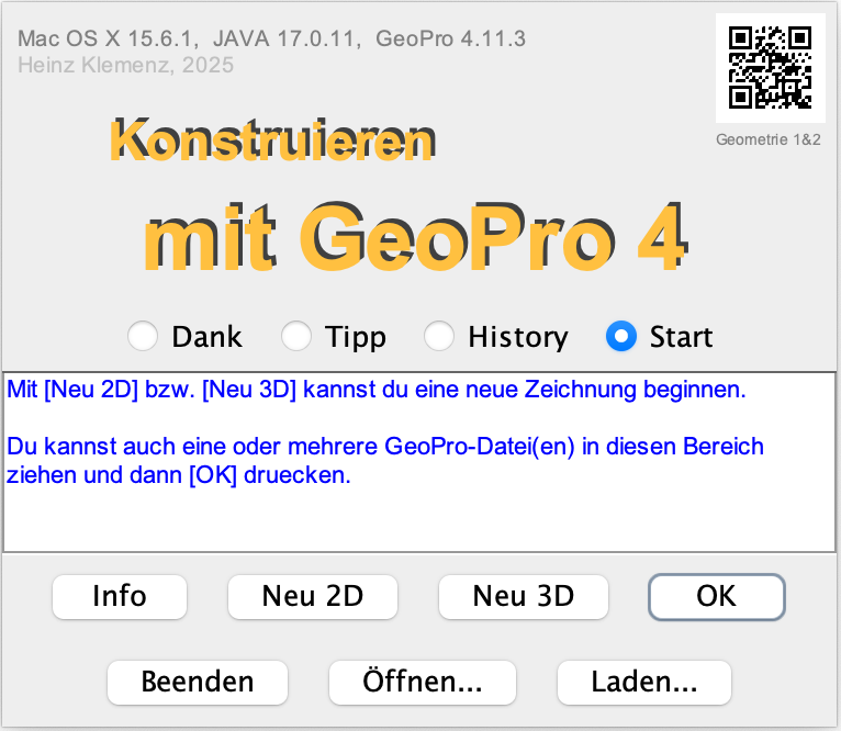 Alternativ muss zuerst GeoPro.jar gestartet werden, wodurch zuerst ein Startdialog geöffnet wird: