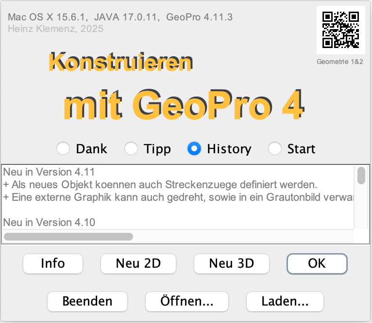 GeoPro-Dateien (z.B. Demo1.g2d) können auch in den weissen Bereich gezogen und dann mit [OK] geöffnet werden. Alternativ können hier auch History-Infos angezeigt werden.